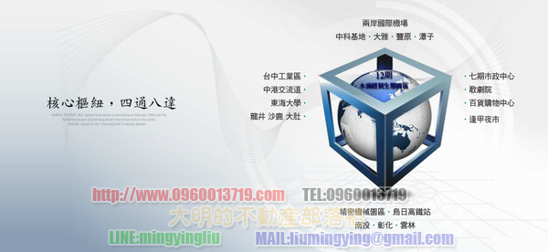 ●「新業博觀」大樓建案,為水湳經貿、中科、新市政特區的樞紐,近中彰快速公路、中港與中清交流道,附近有逢甲商圈、新光三越與老虎城、鄰近8000坪綠地公園,規劃出大坪數生活空