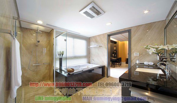 ●2.衛浴地面與盥洗檯面皆用石材、乾濕分離採用玻璃有穿透效果,使浴室視覺變大、設備使用E智慧多功能浴室暖風機。