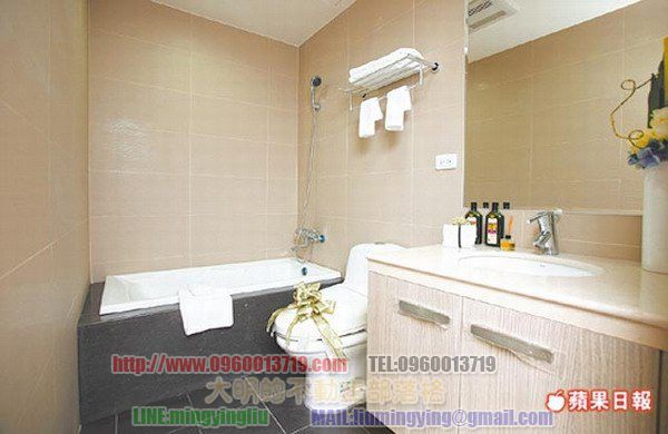 ●主臥衛浴有面盆、浴櫃、浴缸與免治馬桶座