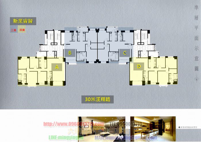 建案的平面圖–大明把房型也用不同顏色標上,均質三房和四房