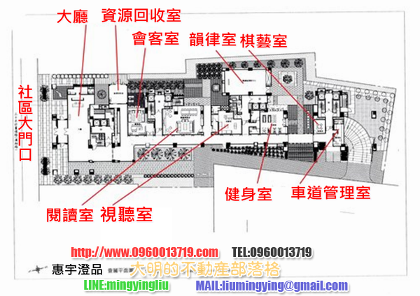 ●1樓並有體適能運動中心、健身房、圖書閱覽室、視聽室等公設。如下圖所示
