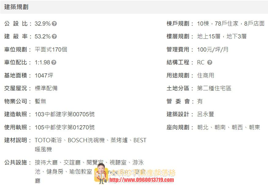 基地面積達1047坪,規劃2棟地上15樓雙塔式建築,1樓臨大墩路退縮11米,規劃8戶店面,標準層住家每層3併、雙梯,均3房格局,設施有藝術廊道、露天游泳池、視聽室及Teahouse